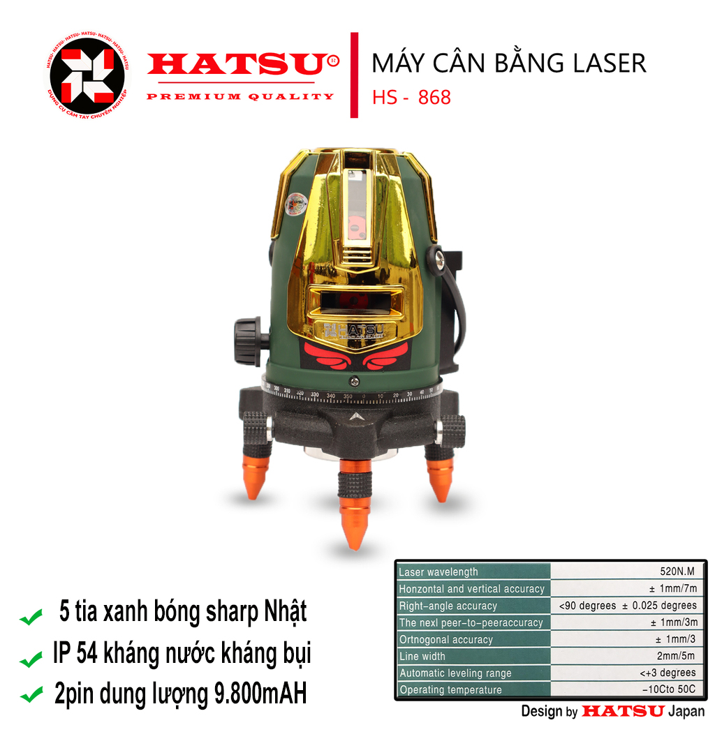 HATSU HS 868 – Số Tia Laser: 04 Tia đứng, 01 Tia ngang, 01 Tia dọi tâm.
